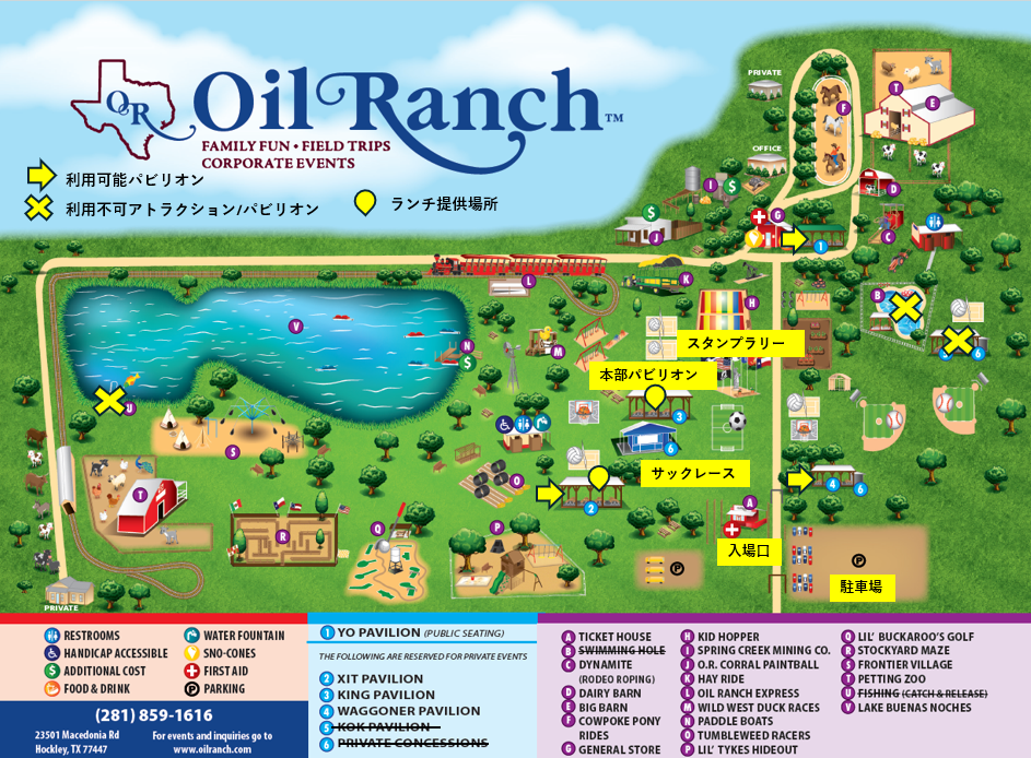 会場内にパビリオンは5つあり、収容人数は下記の通りです。詳しくはOil Ranch内地図をご覧ください。King Pavilion (500名収容可)のみ本部設置のため一部ブロックされ、ご使用いただけません。その他のパビリオンは自由にご利用頂くことが可能となっており、テーブルと椅子が設置されています。少人数で参加される方々にもご配慮の上、できるだけ詰めてお座りいただくようお願いします。